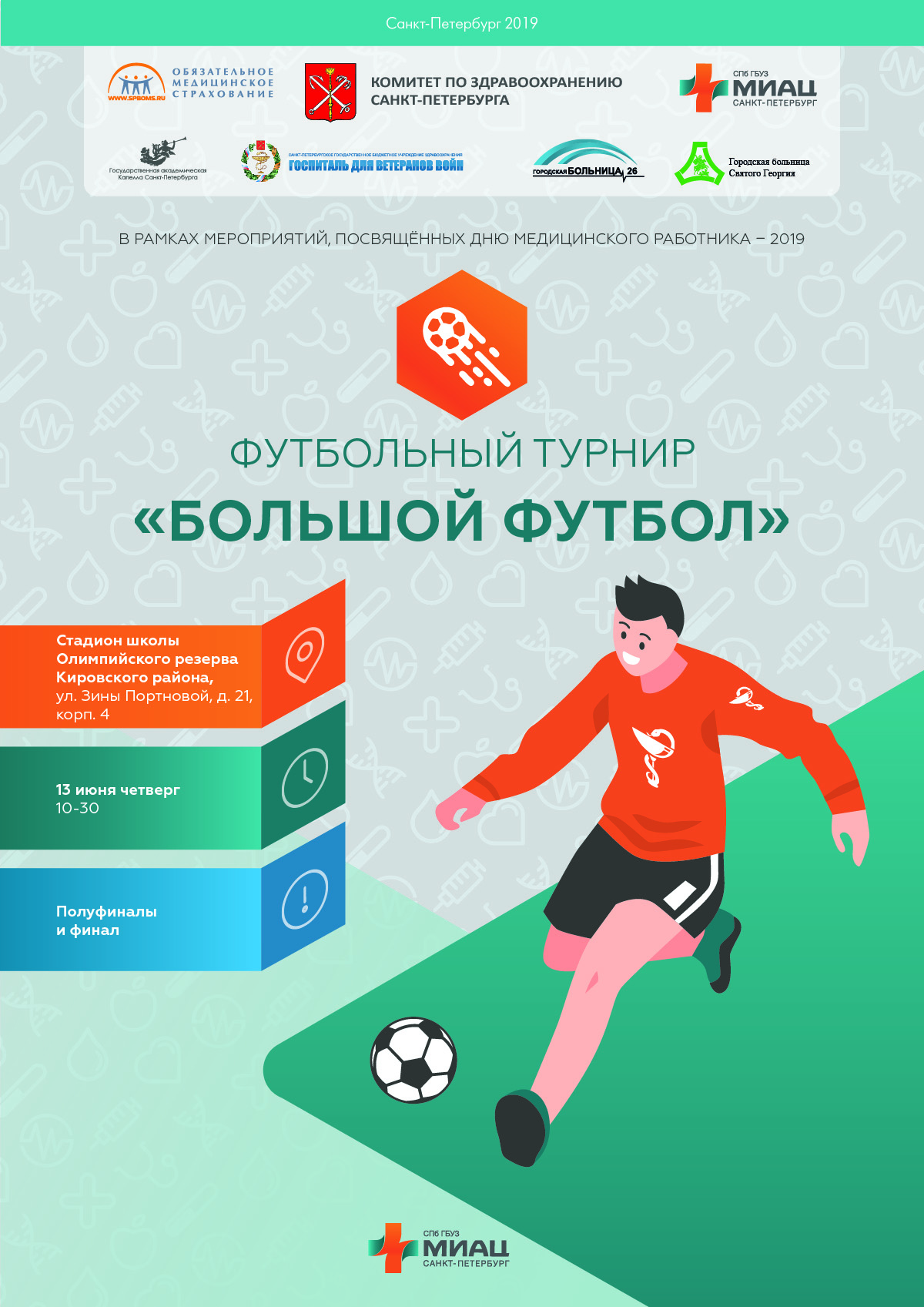 12:20 Городская больница №2 - Александровская больница Госпиталь для ветеранов войн - Мариинская больница 13:10 Центр им. Алмазова - Городская больница №15 ДКБ РЖД – РНИИТО им. Вредена 14:00 НИИ им. Джанелидзе - Больница св. Георгия Елизаветинская больница - Городская больница №26