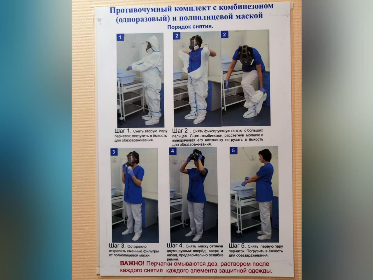 Одежда пациентов в обязательно порядке проходит дезинфекционные мероприятия, что еще недавно не происходило. Персоналу предписано заходить в боксы к больным только облачившись в противочумный комплект – одноразовый защитный костюм, защищающий от особо опасных инфекций. Процедура его надевания занимает минимум 10 минут: необходимо надеть двойные резиновые перчатки, запечатать их липкой лентой, защитные бахилы и полнолицевую маску со сменными фильтрами. После возвращения из бокса необходимо следовать строгой инструкции для снятия костюма. Комбинезон снимается в санпропускнике и погружается в емкость для обеззараживания.