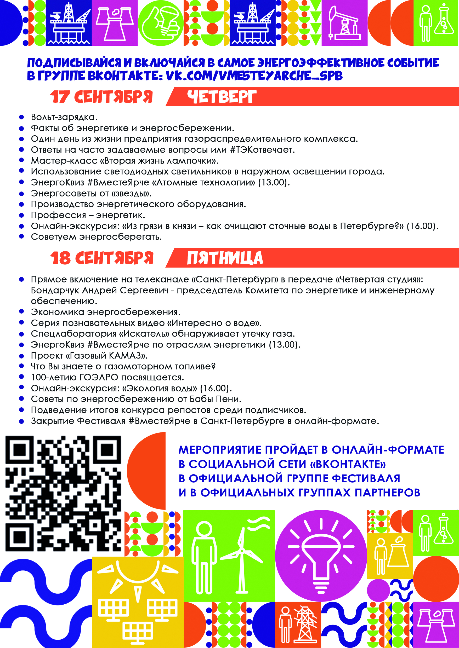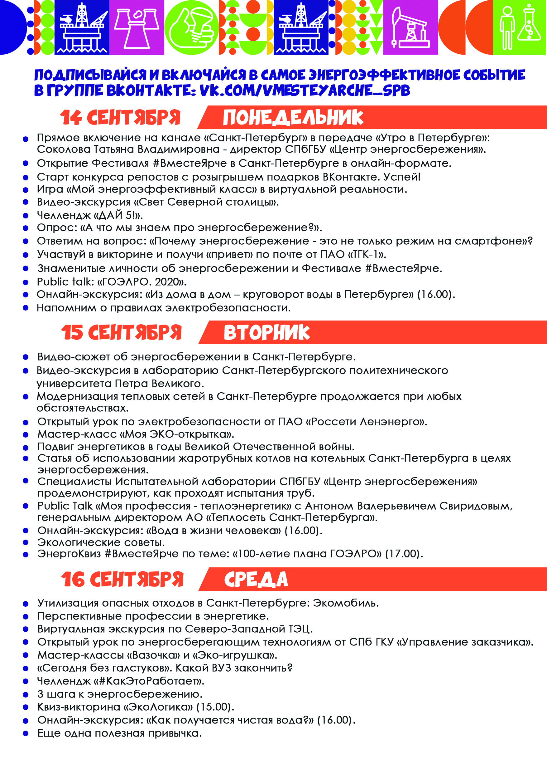 В Санкт-Петербурге в период с августа по октябрь 2020 года проходит пятый Всероссийский фестиваль энергосбережения и экологии #ВместеЯрче, включающий в себя более 160 мероприятий.