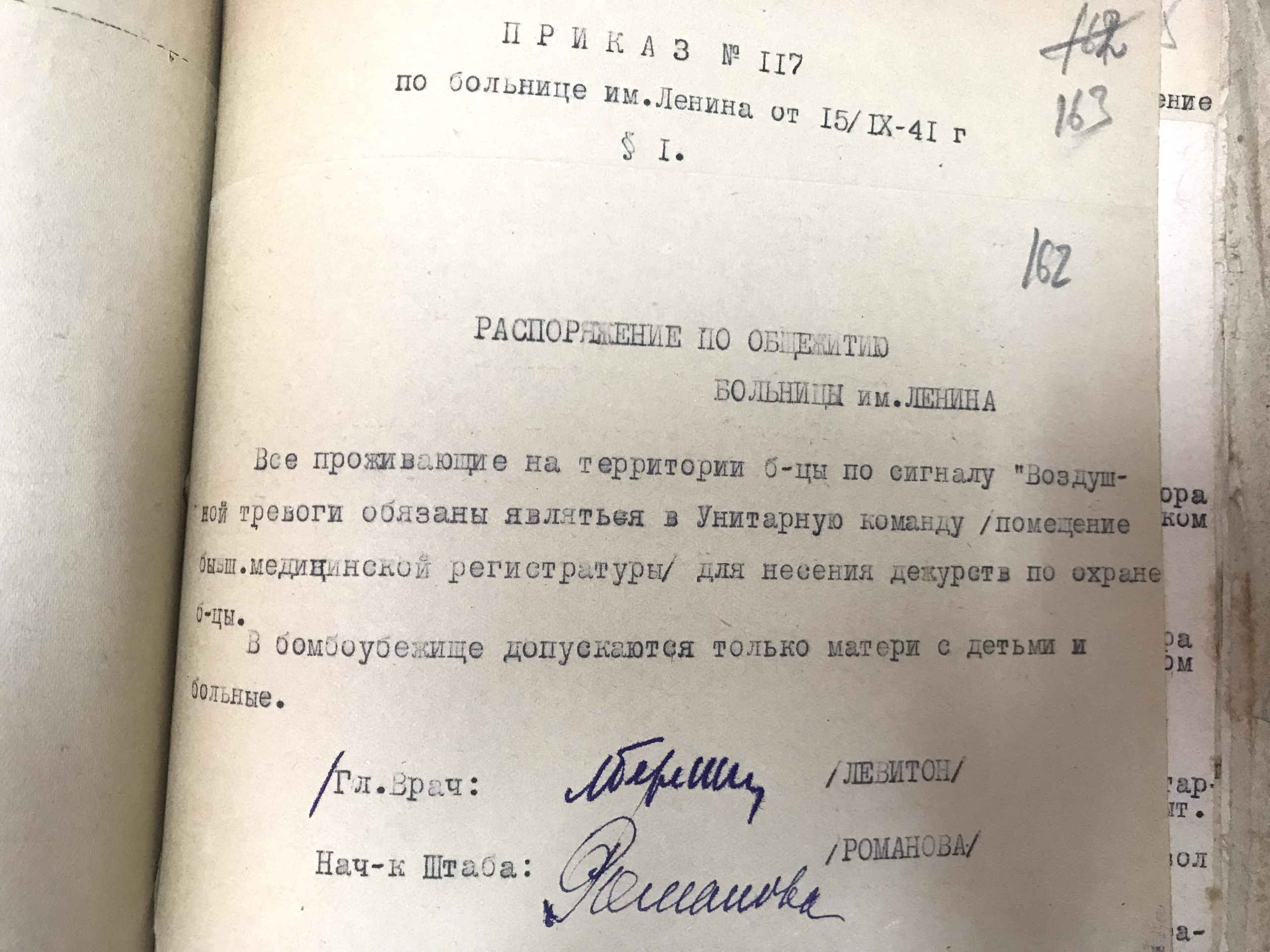 «14-12-41 г. В первом этаже выбило стекла в палатах, выходивших во двор. Та же картина на втором этаже: дежурная сестра подсчитала, что выбитыми оказались 32 стекла. На полу нашли два или три осколка от снарядов. После стихания обстрела мне сообщили, что рядом с нашим корпусом побит корпус, где находится отделение Бойчевской. Снаряд попал в амбулаторию. Я туда сам не ходил, точно не знаю. Завтра выяснится. Во время этого обстрела сестры и сиделки живо вытащили больных в коридоры. Молодцы!».