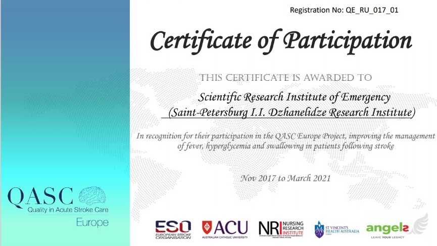 Завершился трехлетний проект QASC Europe (Quality Acute Stroke Care), посвященный улучшению исходов после инсульта, внедрению в практику мониторинга и лечения предикторов ранних осложнений, – лихорадки, гипергликемии, нарушения глотания. Проект реализовывался с ноября 2017 года по март 2021 года, и от России в нем принимали участие три учреждения, имеющие в своем составе региональные сосудистые центры для больных с инсультом. Среди них – Санкт-Петербургский НИИ скорой помощи имени И.И. Джанелидзе.По результатам участия в проекте Институту скорой помощи им. И.И. Джанелидзе и сотрудникам отдела острой цереброваскулярной патологии и неотложной неврологии Научным Комитетом проекта Clinical Research Fellow & QASC Europe Project были вручены сертификаты Certificate of Participation.