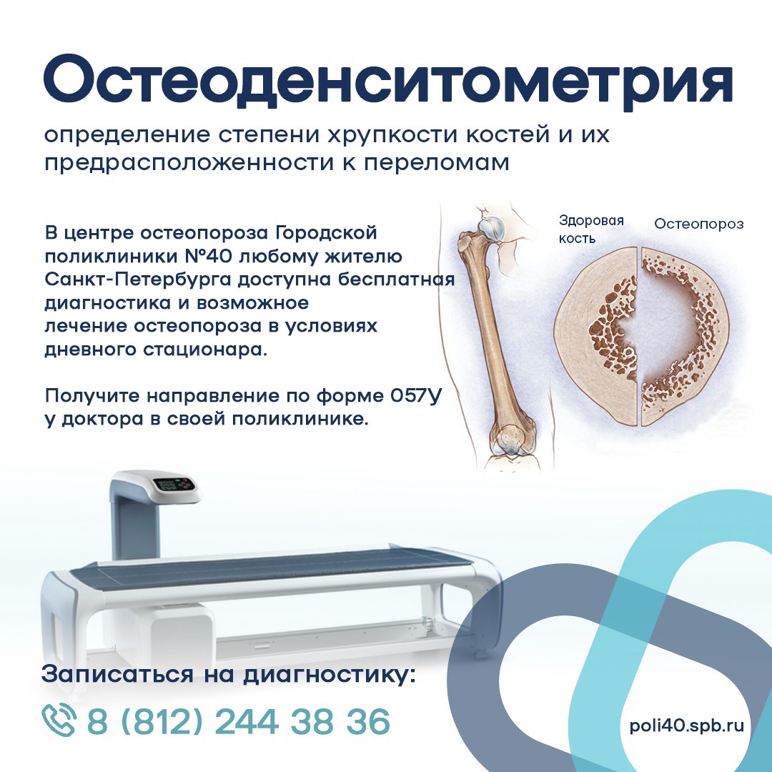 Комитетом по здравоохранению принято новое распоряжение «Об организации направления пациентов на рентгеноденситометрию». Данное исследование проводится для исследования минеральной плотности костной ткани, диагностики риска переломов и оценки композиционного состава тела. Оно позволяет на ранних этапах выявить остеопороз.