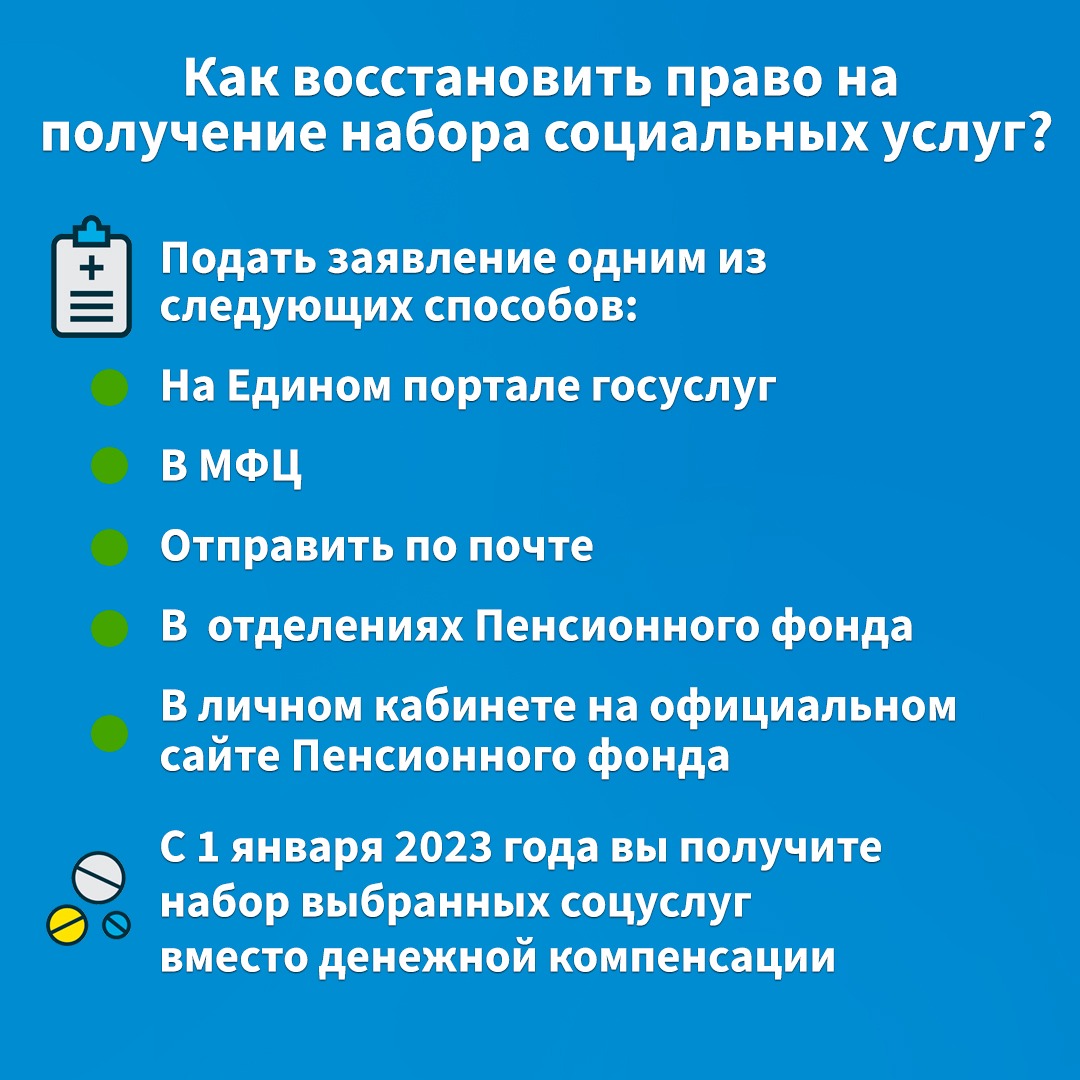В случае, если гражданин, имеющий право на получение набора социальных услуг, ранее отказался от социальной услуги по лекарственному обеспечению, для возобновления бесплатного получения лекарственных препаратов в следующем году необходимо до 1 октября 2022 года обратиться в Пенсионный фонд России. Заявление можно подать в электронном виде в личном кабинете на сайте Пенсионного фонда России, либо через Единый портал государственных услуг Санкт-Петербурга.