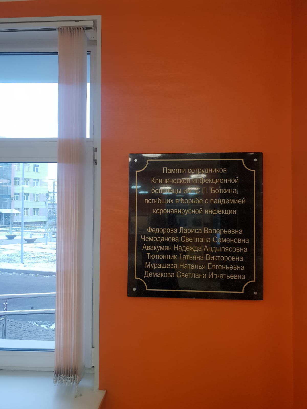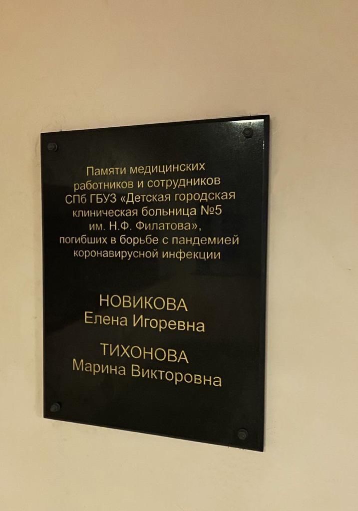 В Детской городской клинической больнице № 5 им. Н. Ф. Филатова и Клинической инфекционной больнице им C.П. Боткина установили памятные доски в честь сотрудников, погибших от ковида.