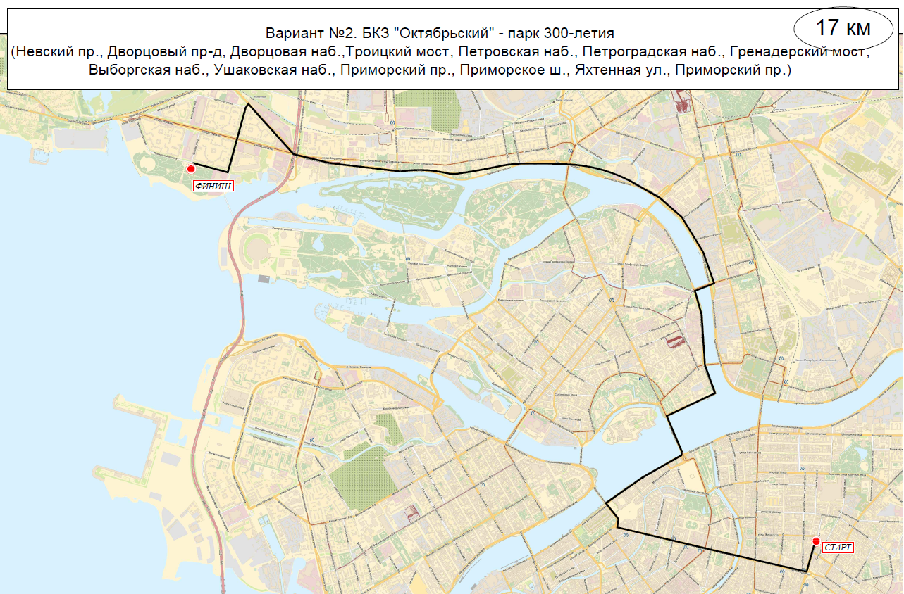 Велосипедисты проедут от БКЗ «Октябрьский» до парка 300-летия Петербурга. Протяженность маршрута составит 17 км. Он пройдет по таким знаковым местам города, как Невский проспект, Дворцовая набережная, Троицкий мост, Гренадерский мост, Ушаковская набережная и Яхтенная улица.