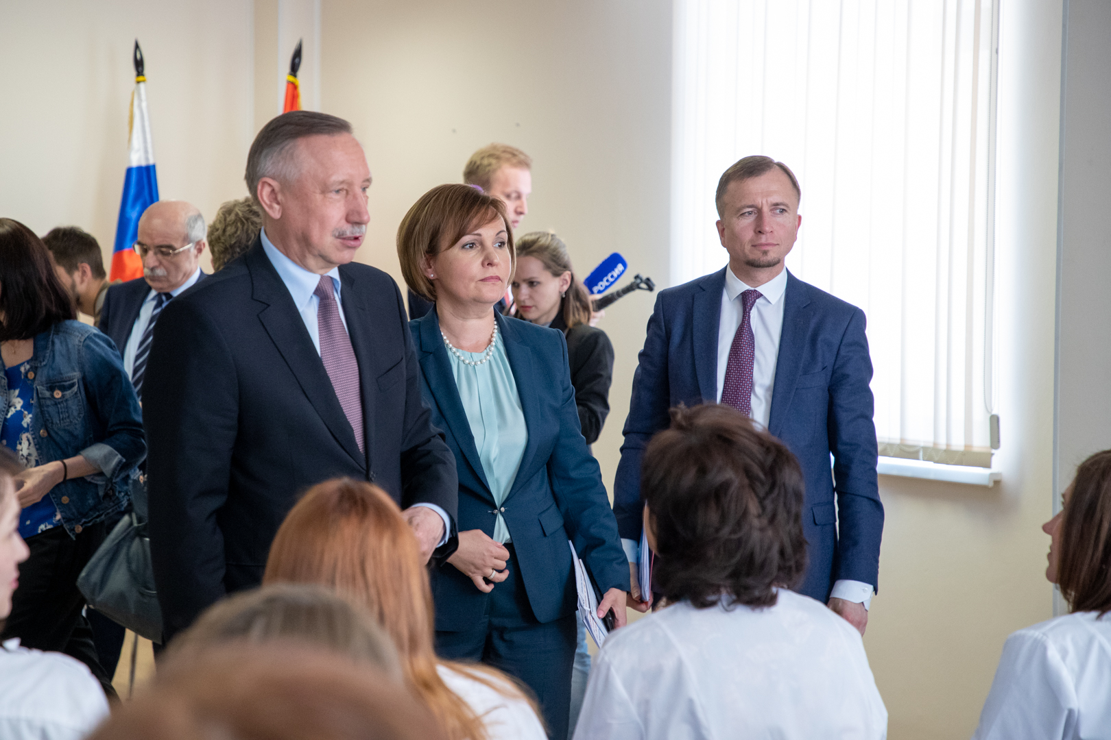 Временно исполняющий обязанности губернатора Петербурга Александр Беглов, вице-губернатор Анна Митянина и председатель Комитета по здравоохранению Дмитрий Лисовец