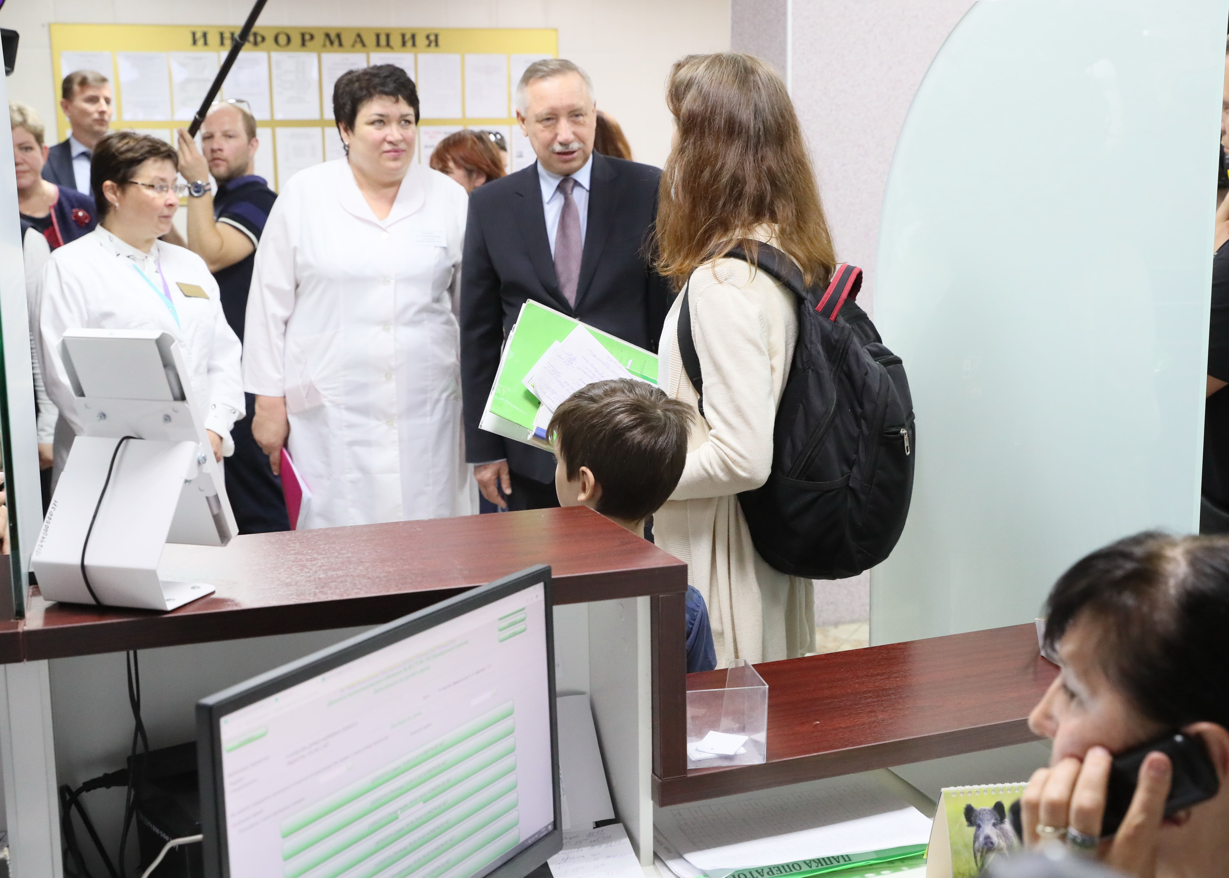 Александру Беглову продемонстрировали первые достижения в ходе реализации проекта. В ДПО №50 появилась открытая регистратура: в холле работают дежурные администраторы, которые подсказывают маршрут в зависимости от цели визита. К окну регистратора посетителей приглашают по электронному номеру, который отображается на электронном табло или посредством голосового оповещения. Записаться на прием к врачу можно через два инфомата в холле. «Полный переход поликлиники на «бережливые» принципы должен произойти до конца августа, но первые результаты уже доказывают эффективность проекта. Наша задача – сэкономить время посетителей и научить детей не бояться врачей», – сказал Александр Беглов.