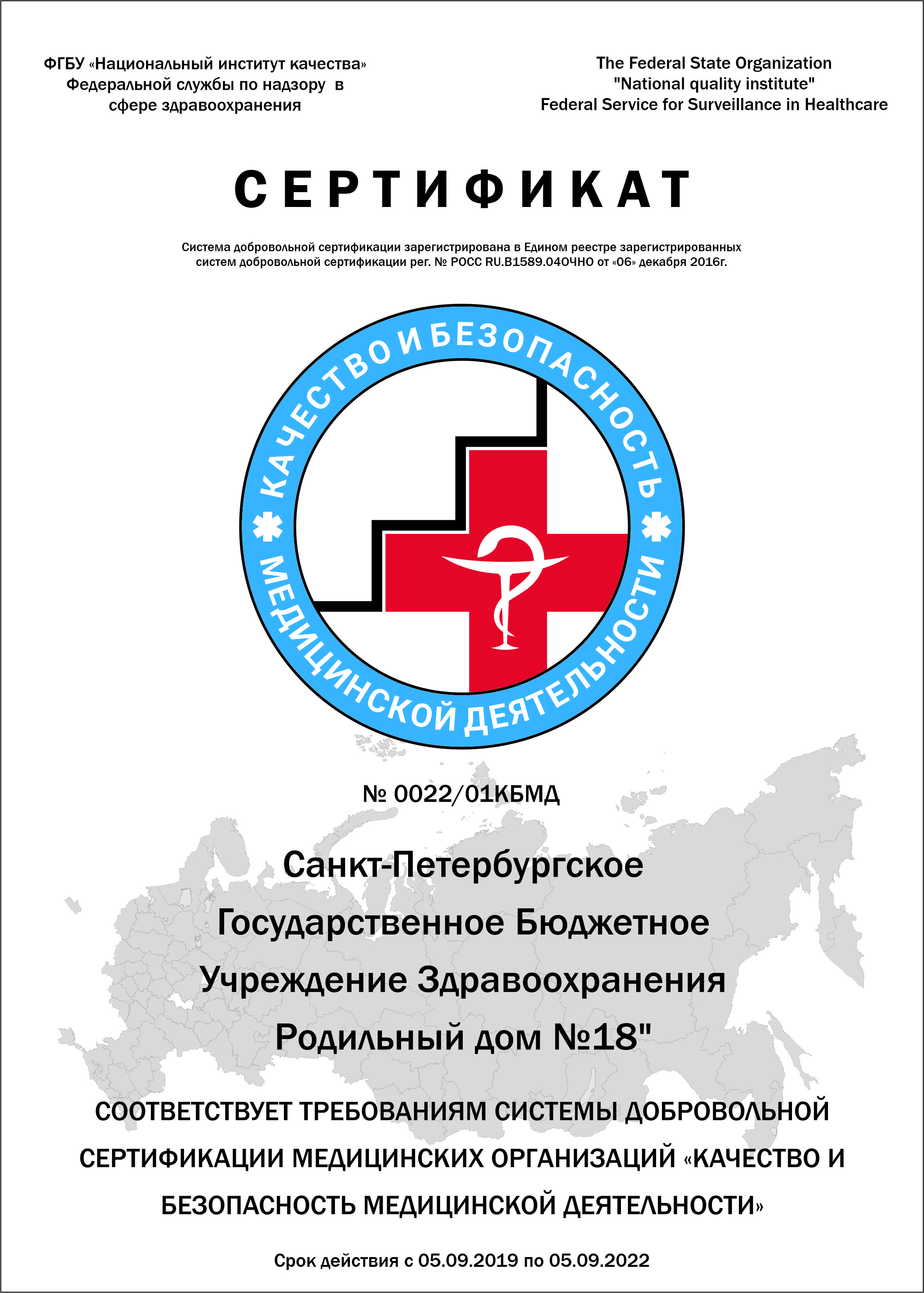 СПБ ГБУЗ «Родильный дом № 18» стал первым роддомом в России, получившим сертификат «Качество и безопасность медицинской деятельности».