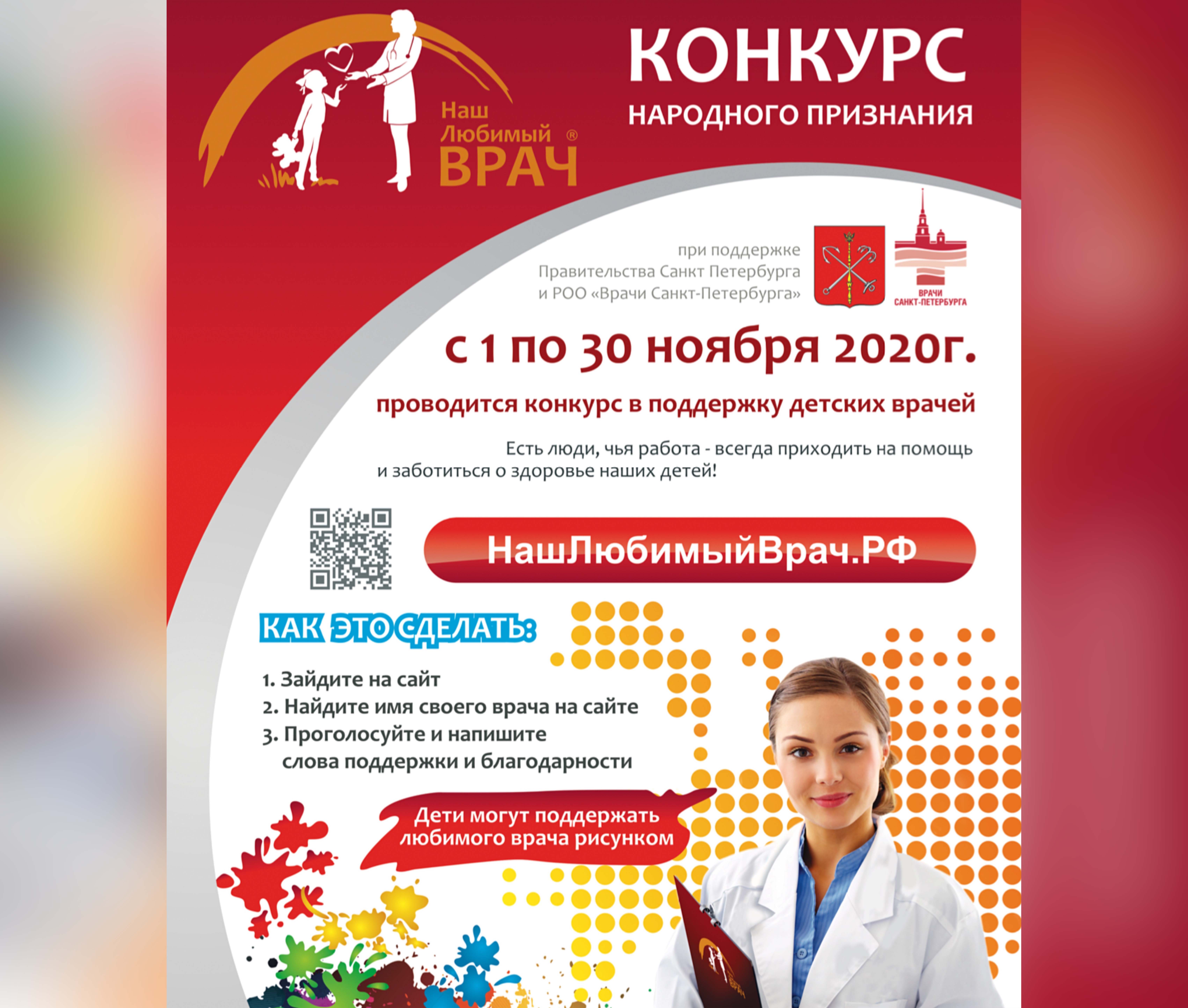 В период с 1 по 30 ноября под эгидой РОО «Врачи Санкт-Петербурга» и при поддержке Правительства Санкт-Петербурга в 9-й раз состоится Конкурс народного признания «Наш Любимый ВРАЧ», в котором примут участие врачи-педиатры и детские врачи-специалисты лечебно-профилактических учреждений города.